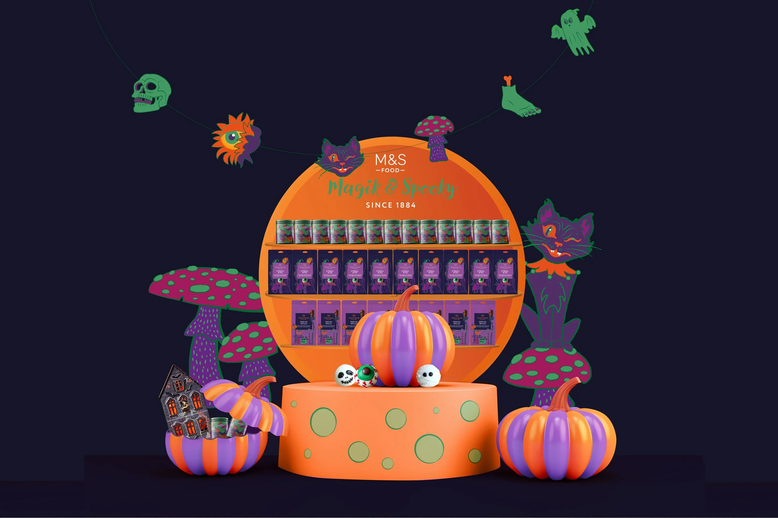 With this self-initiated concept I play on the existing ‘Magic & Sparkle’ M&S Christmas tagline, giving it a spooky Halloween twist. I created bold, colourful illustrations which would be ownable and adaptable, from packaging and POS to windows. I also created animations for a landing page and social media